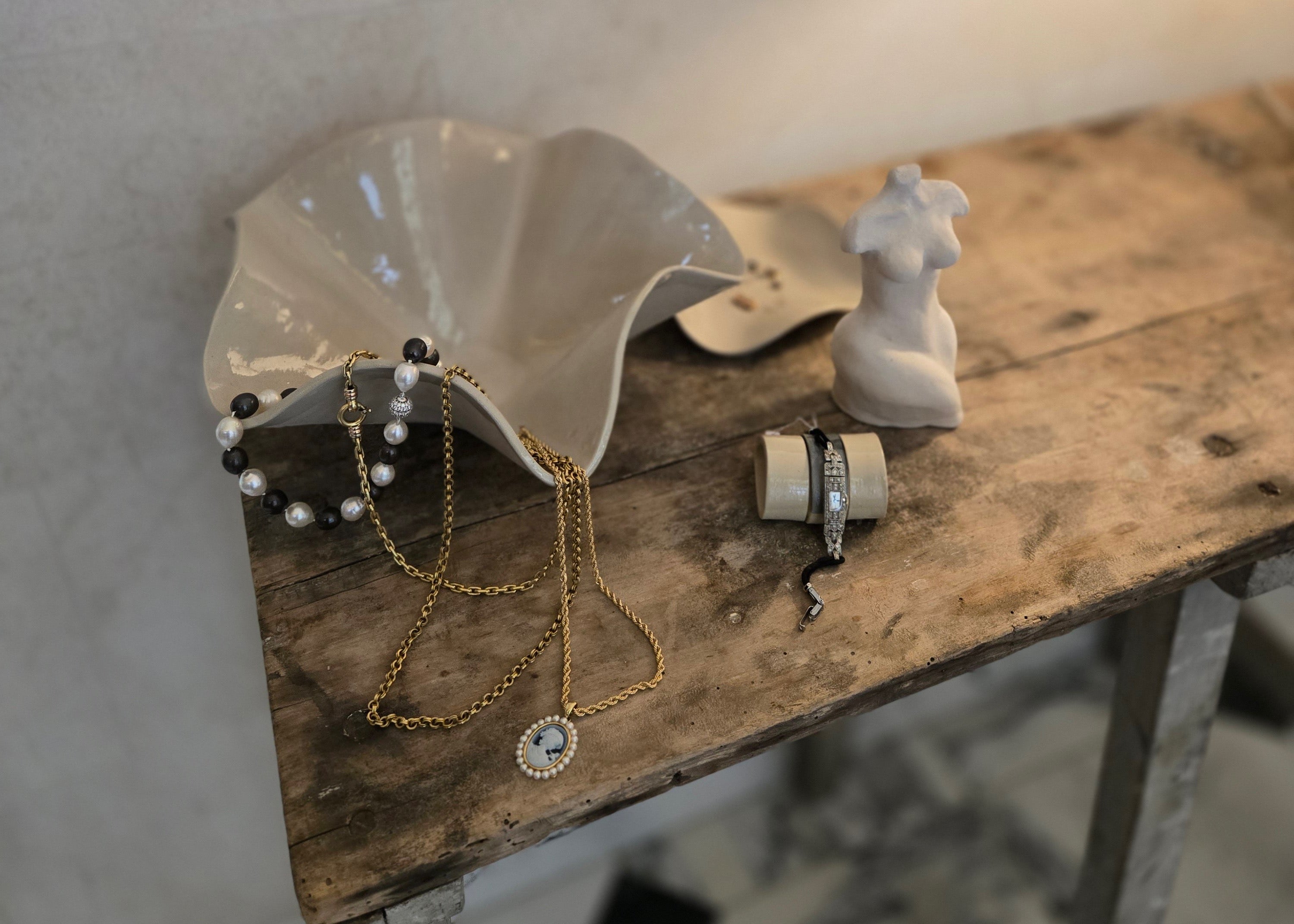 Certaines de nos photos mettent en scène les créations en céramique de Sidonie Céramique, dont l’esthétique dialogue avec celle de nos bijoux.